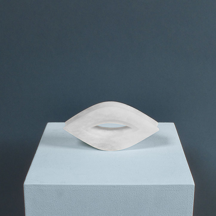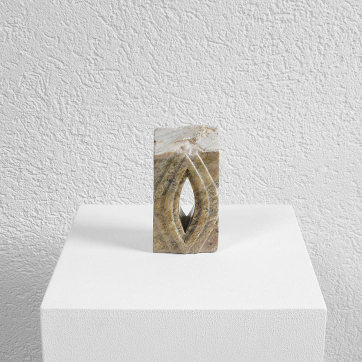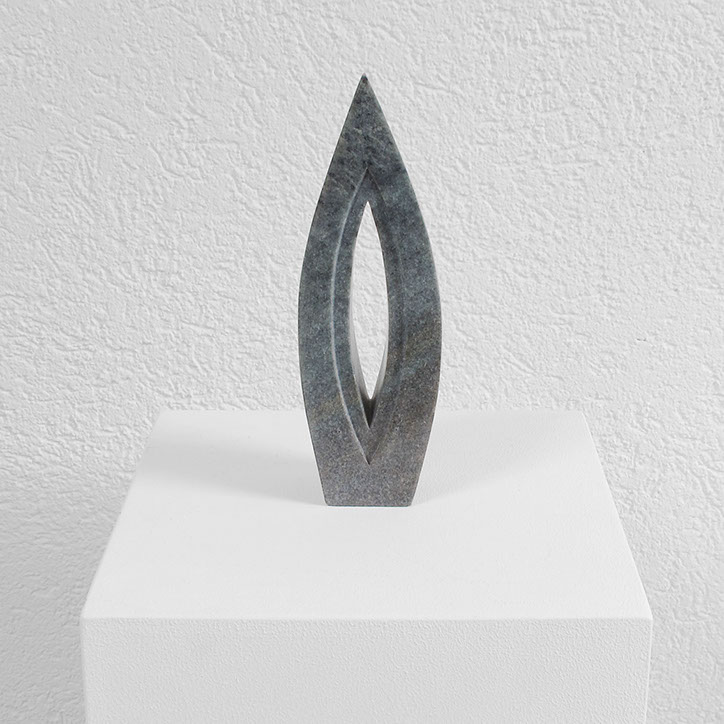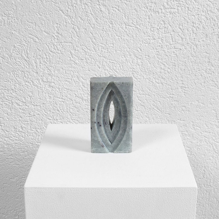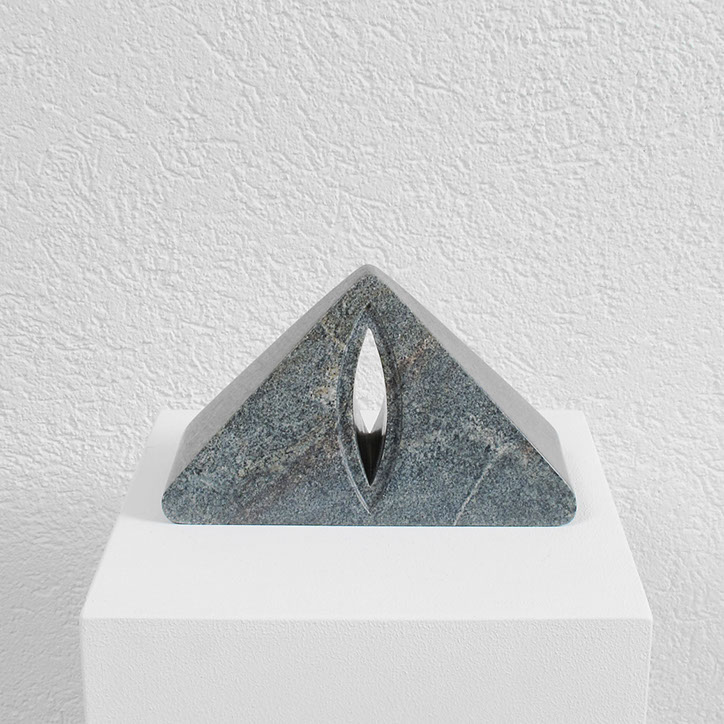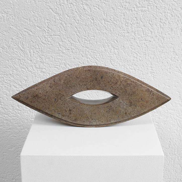 Diese Arbeit besteht aus acht Steinen (Steatit und Alabaster) mit spitzovalen Durchblicken (vertikal oder horizontal). Es reizte mich, Stück für Stück durch den dichten Stein vorzudringen, in die Tiefe zu gehen, “vom Dunkeln ins Licht“, erst Durchbruch, dann Durchblick, Geburt und Tod und Geburt...
